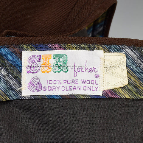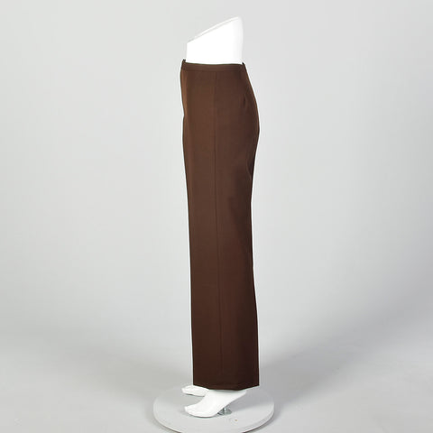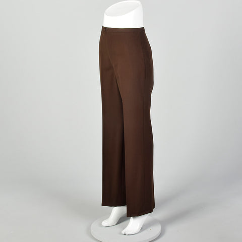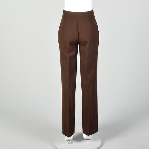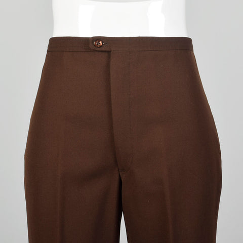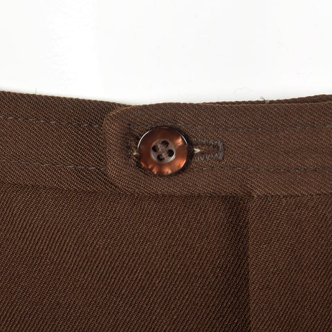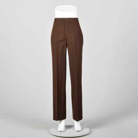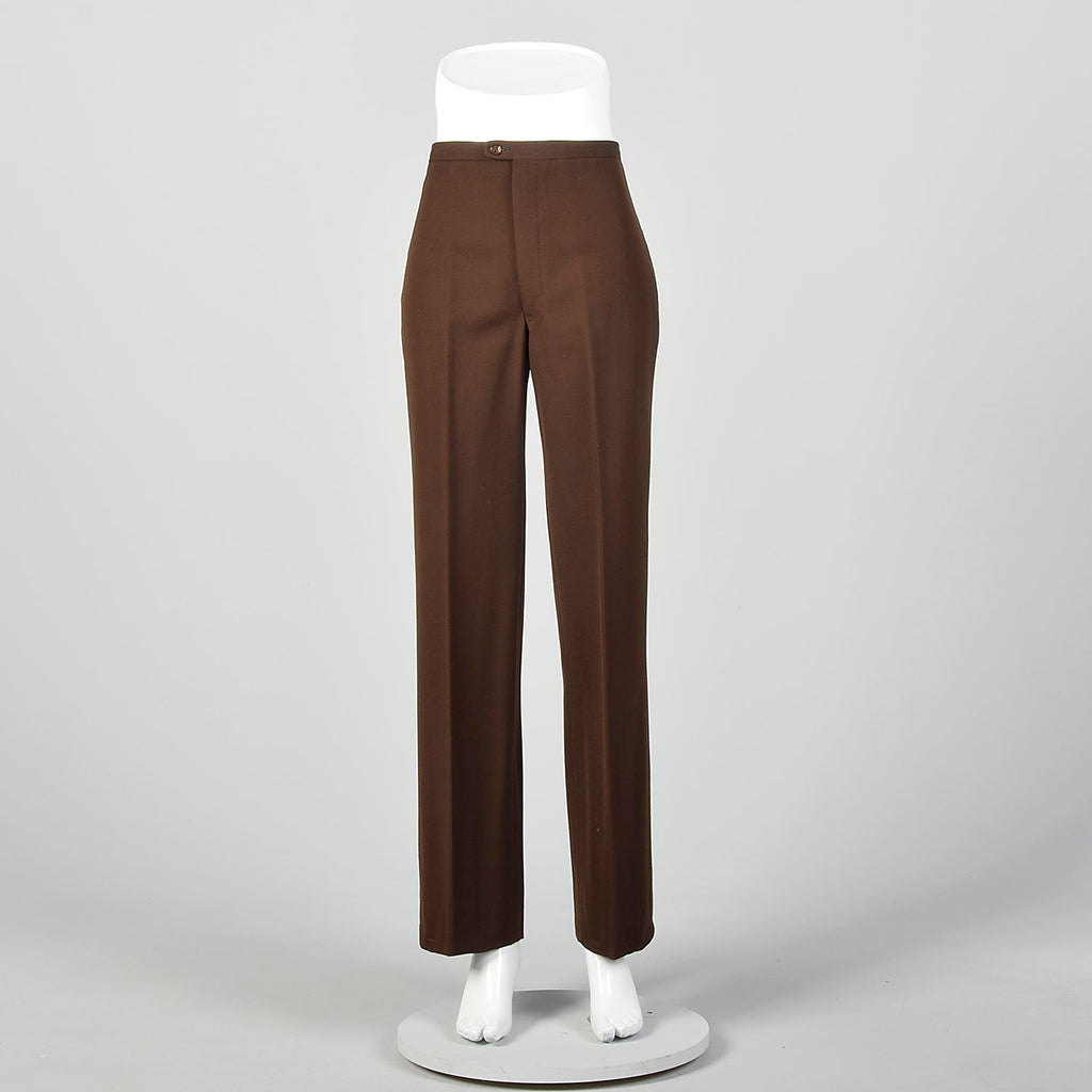 This listing is for one pair of pants. The textile is wool. Classic brown trouser. Wide leg and creased front. High waist with fun striped tap insi...