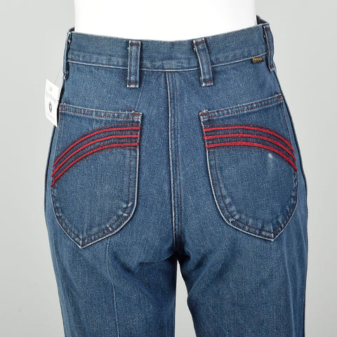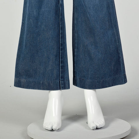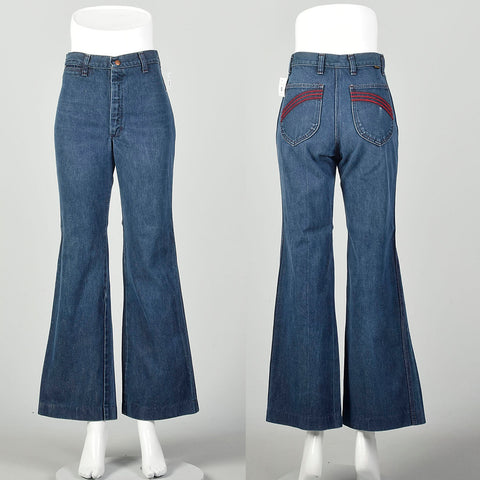 Small 1970s High Waisted Jeans Hippie Bell Bottoms Embroidered Pockets
