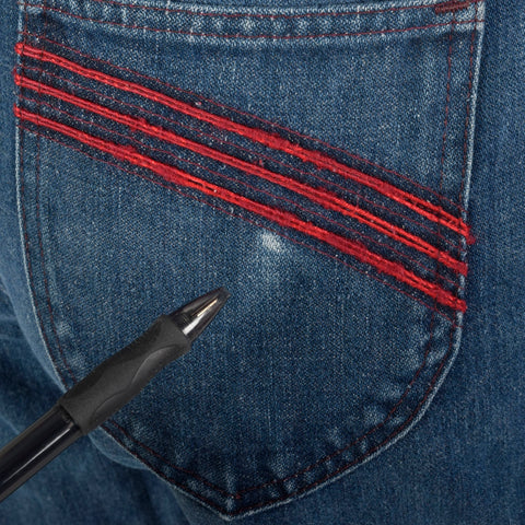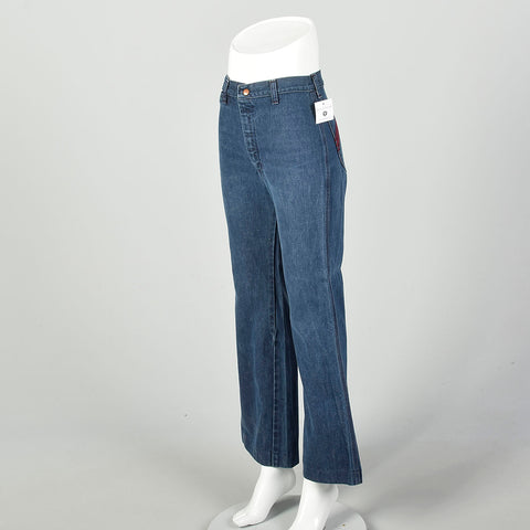 These bell bottom jeans are high waisted and have great embroidery! There is red corded trim on both back pockets, as well as subtle red trim throu...