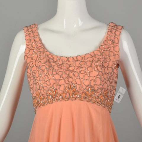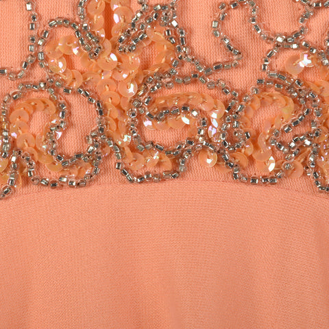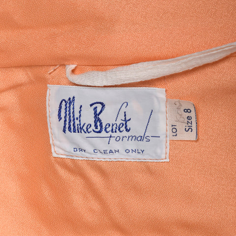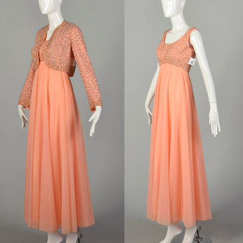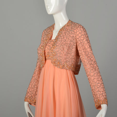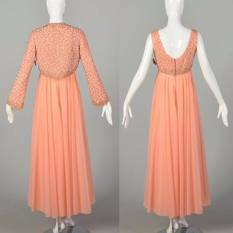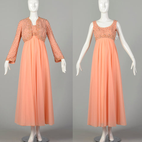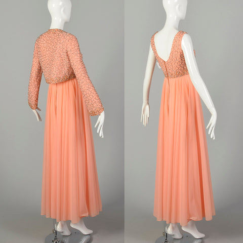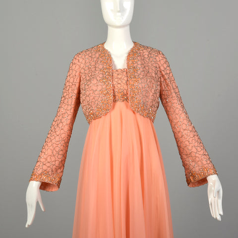 Small 1970s Mike Benet Set 2pc Orange Beaded Jacket Maxi Prom Formal Gown