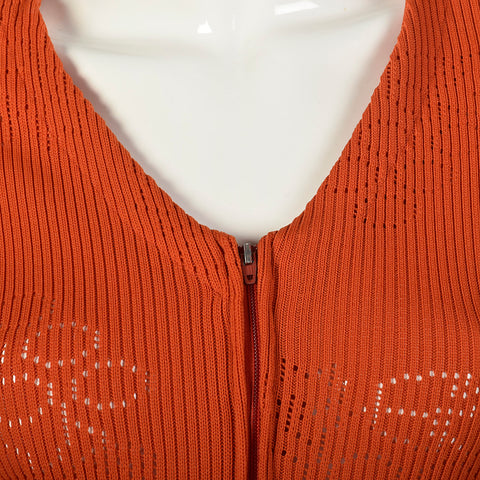 Orange ribbed knit jumpsuit with a zip up front, wide pant legs, and a tieback waist. Knit textile has a lot of give and will fit a wide range of s...