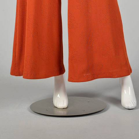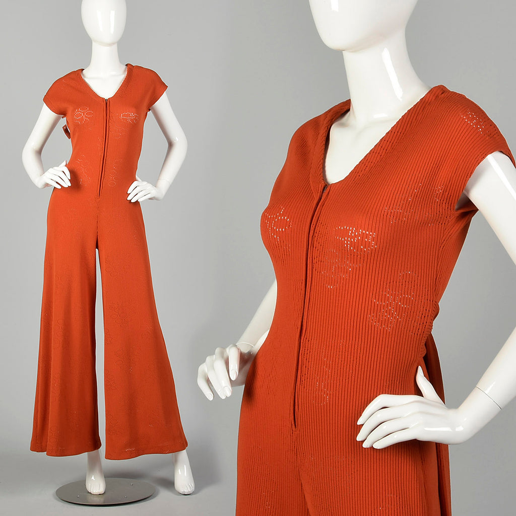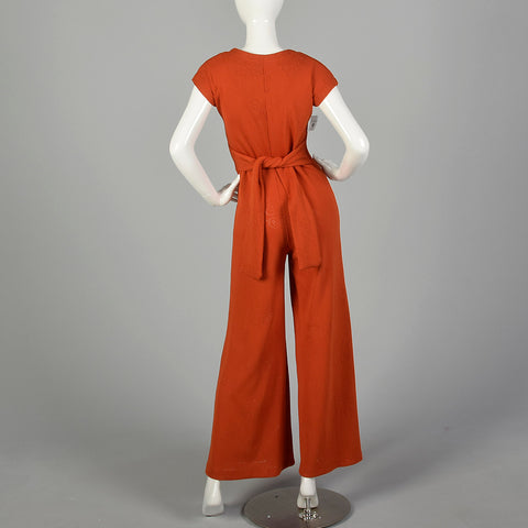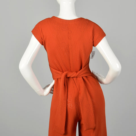 Small 1970s Wide Leg Orange Ribbed Knit Jumpsuit Sexy Tieback Waist