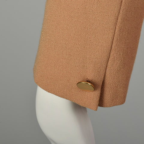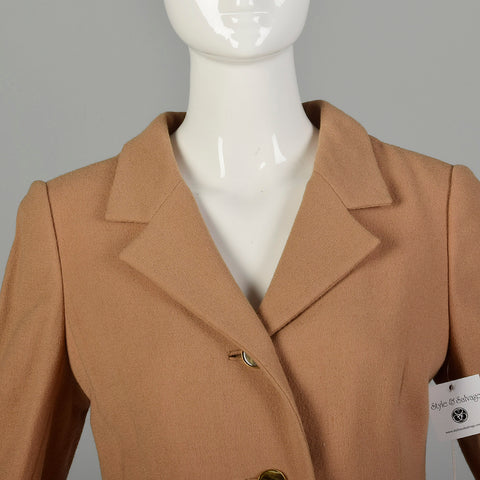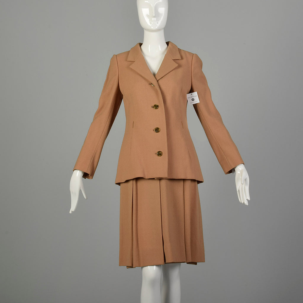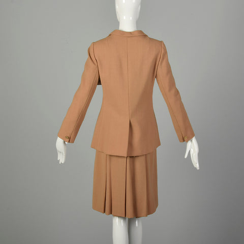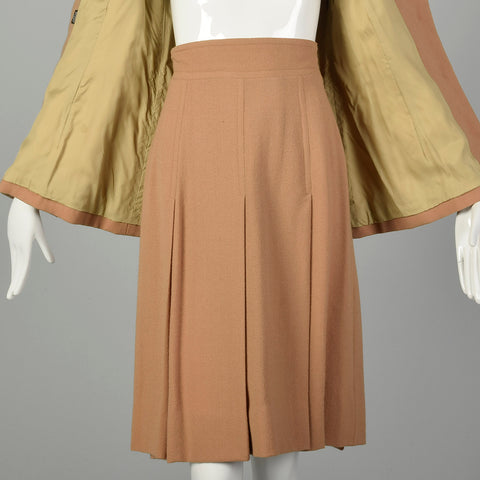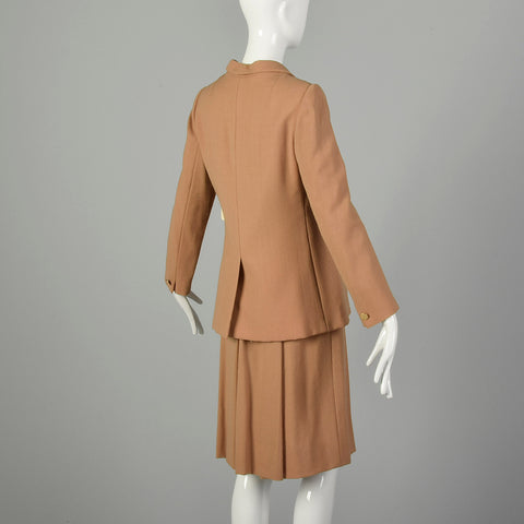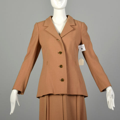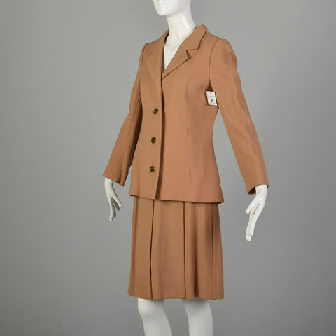 Small 1970s Suit Minimalist Camel Pleated Skirt 2pc Blazer Ensemble