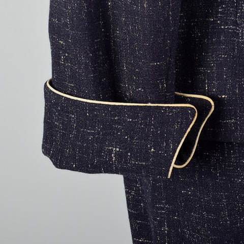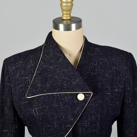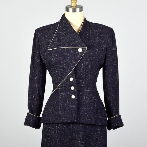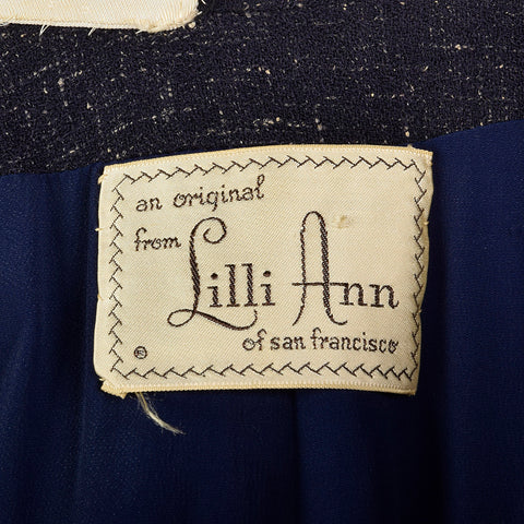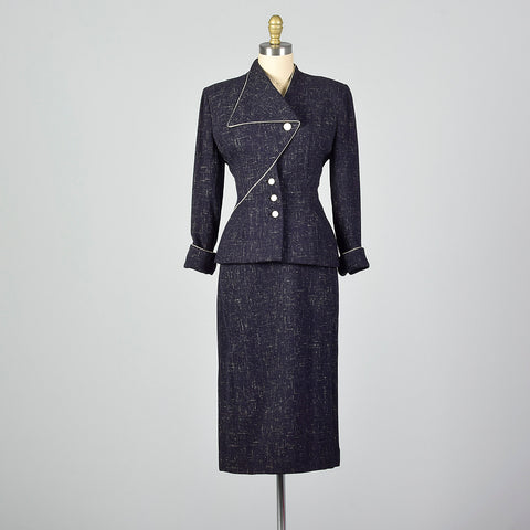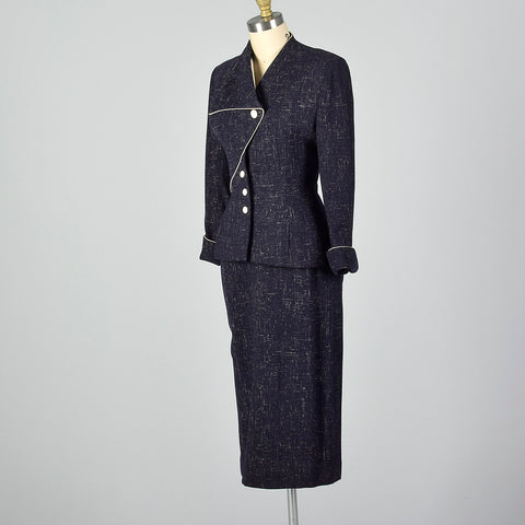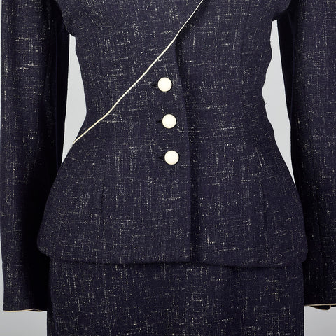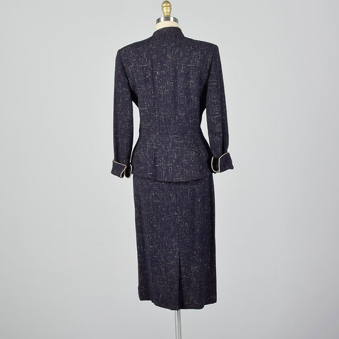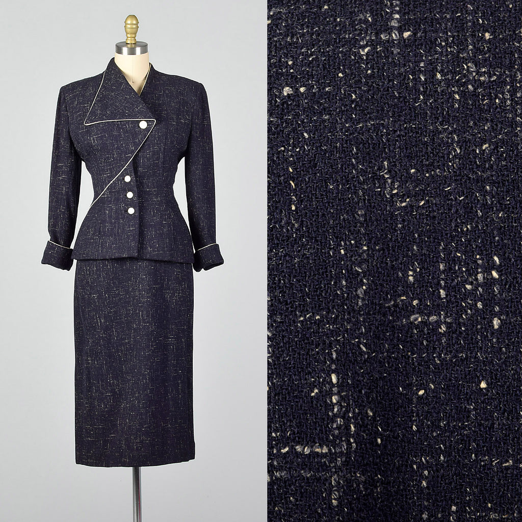 This listing is for one blazer and skirt. Textile is an unmarked winter weight atomic fleck wool in navy blue. Skirt suit is by Lilli Ann. Blazer f...
