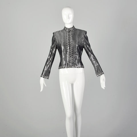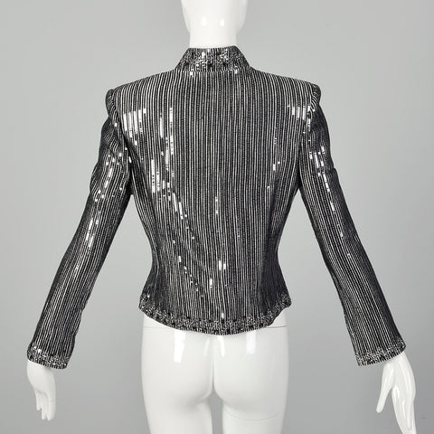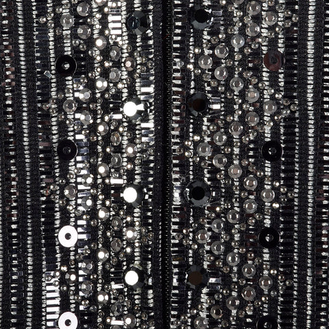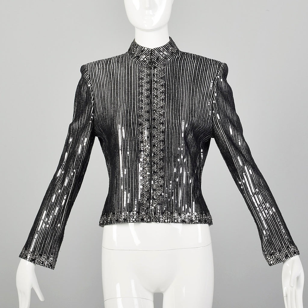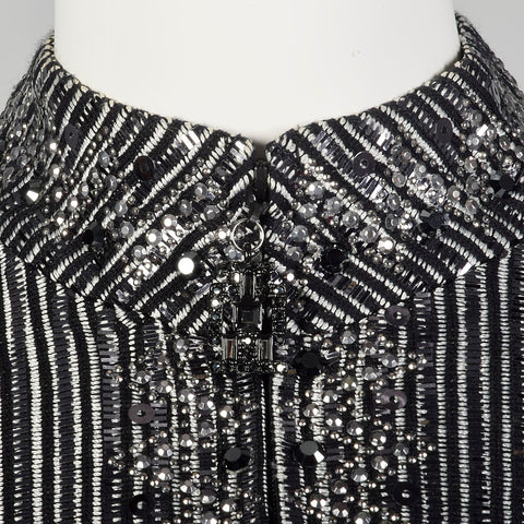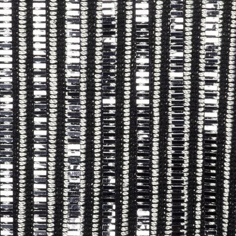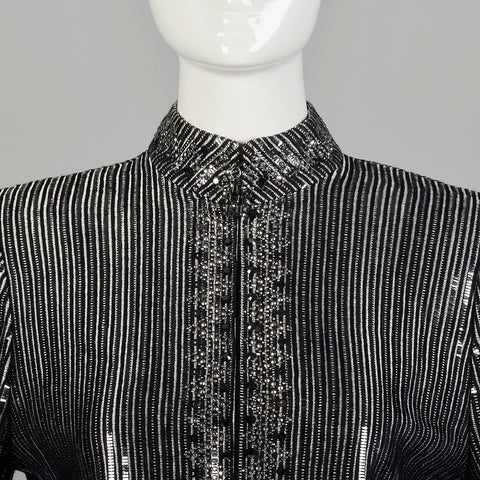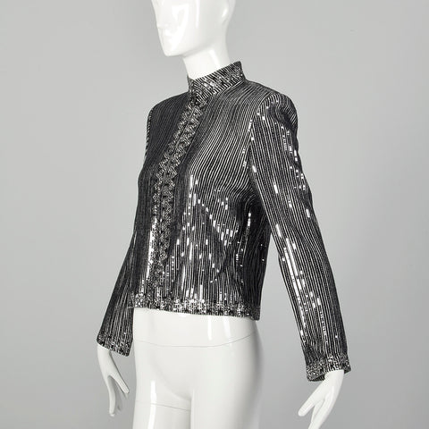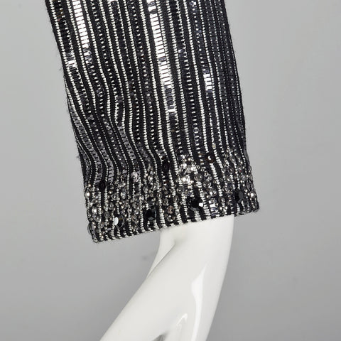 This listing is for one top. The textile is unmarked knit. Metallic silver and black sequin striped pattern. Silver sequin and black rhinestone tri...