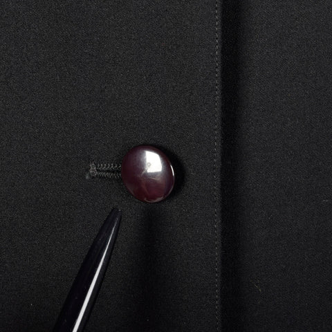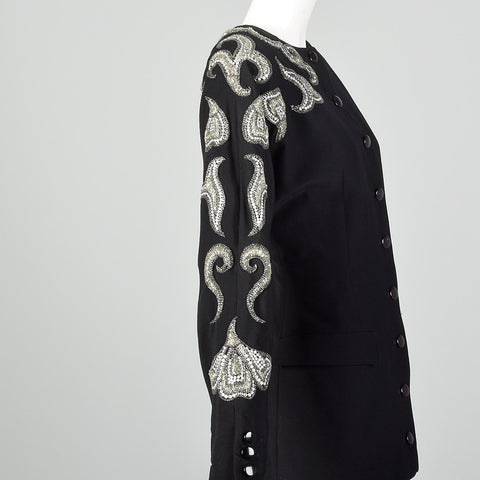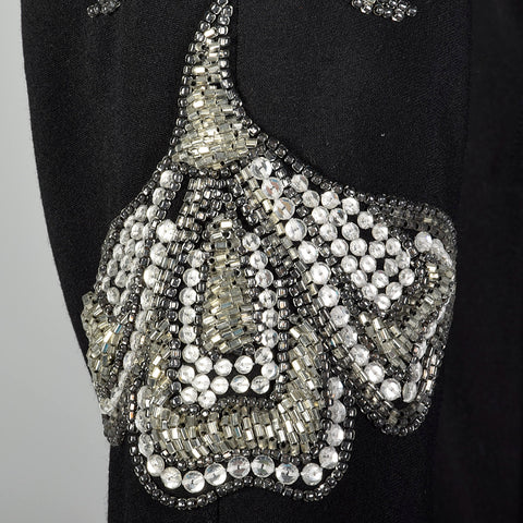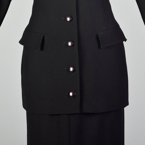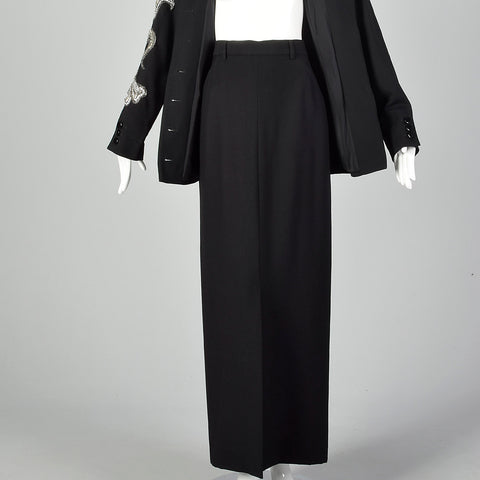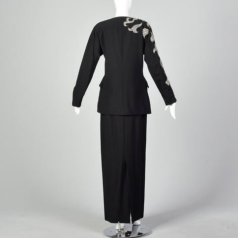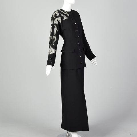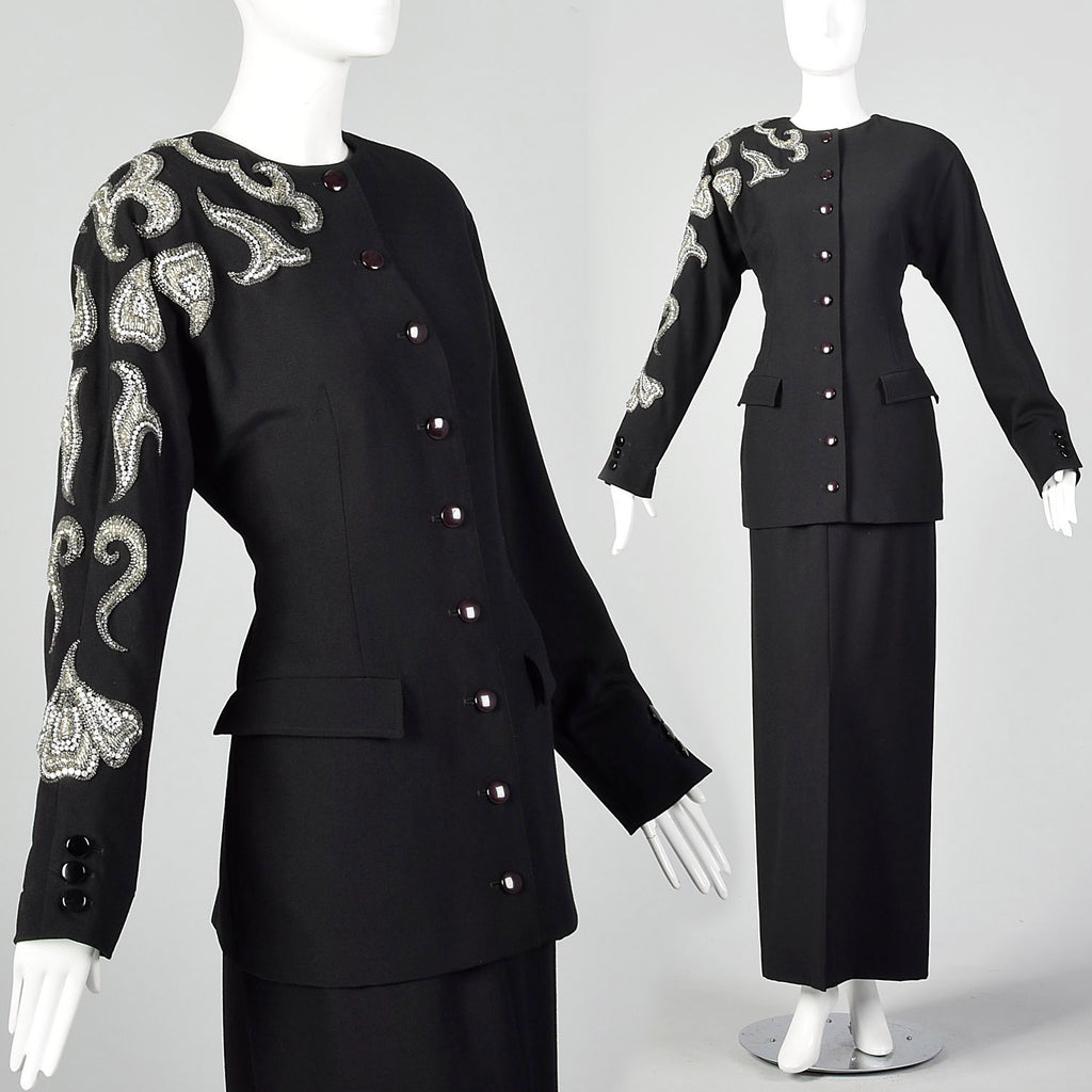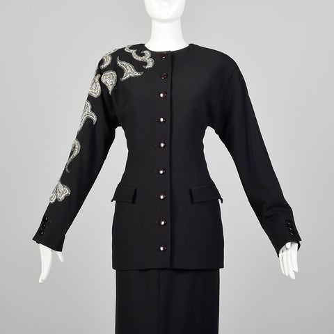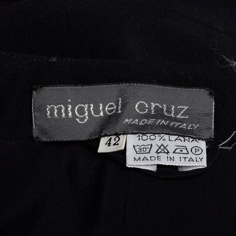 This listing is for one two piece skirt suit. Textile is a winter weight wool in black. Suit by Miguel Cruz features heavily beaded jacket with cre...