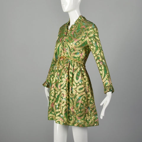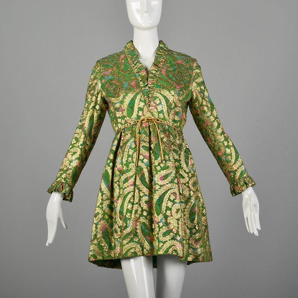 This listing is for one dress. The textile is unmarked. Groovy gold metallic and green mini dress. Paisley print in green, gold, purple, blue, and ...