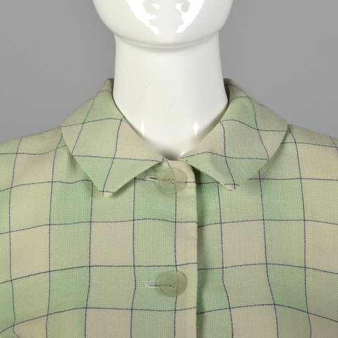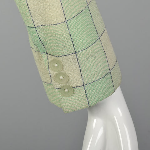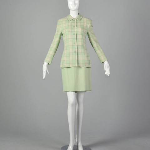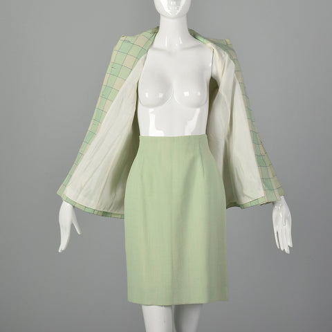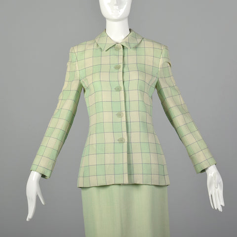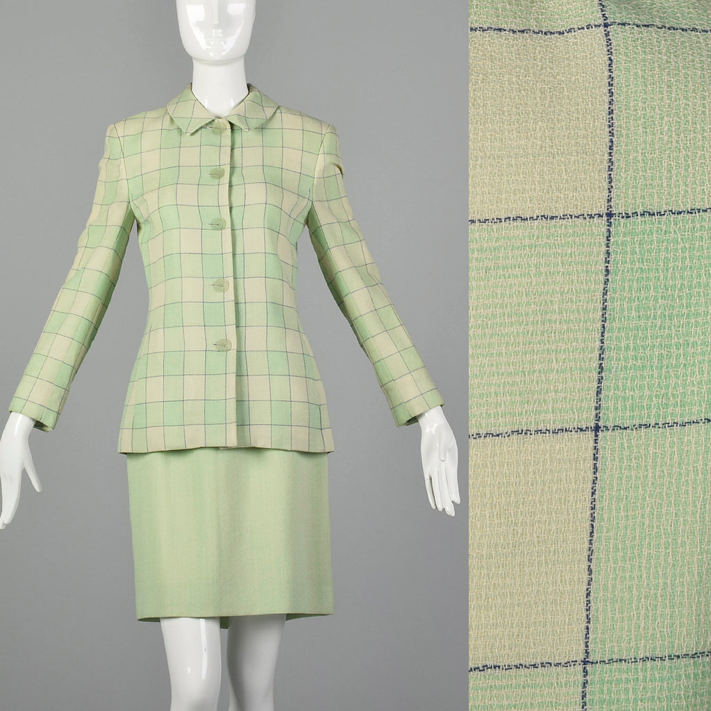 This listing is for one skirt and one jacket. Textile is a mid weight 100% wool with crepe weave. Suit features windowpane plaid blazer with straig...