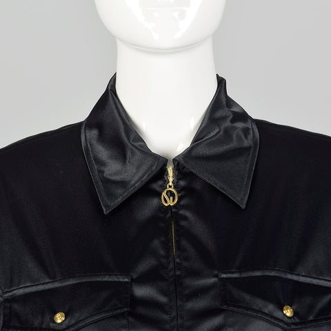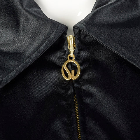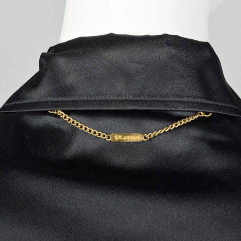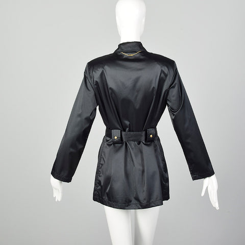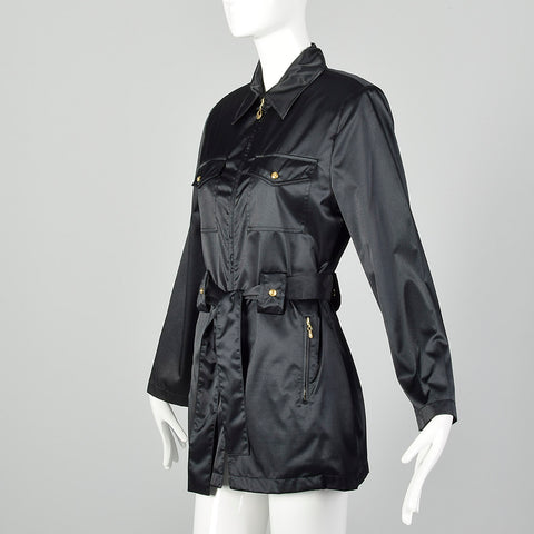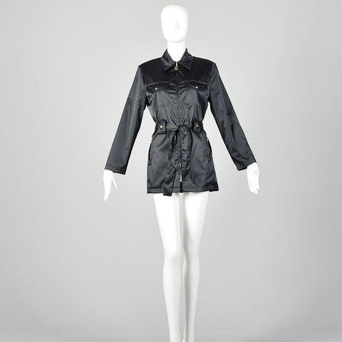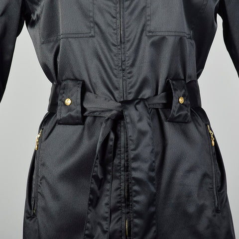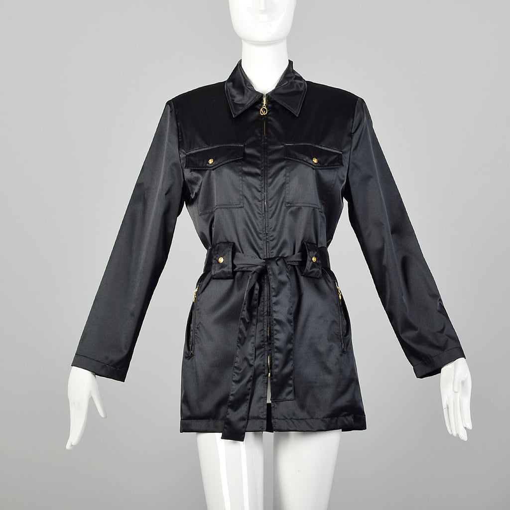 This listing is for one coat. The textile is unmarked. Black satin, lightweight coat. Mini trench with tie belt. Two patch pockets on the front wit...
