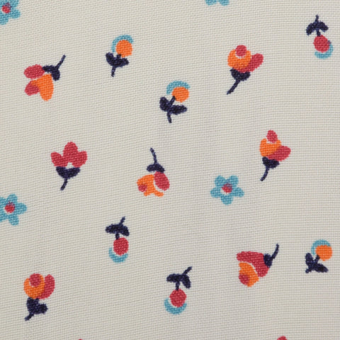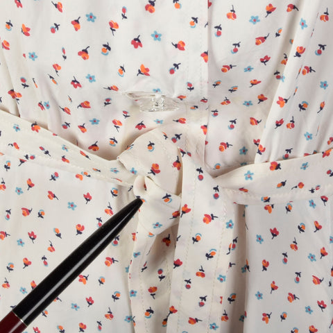 This voluptuous summer dress has a tiny colorful flower pattern scattered across a white background. There are four fully functioning crystal butto...