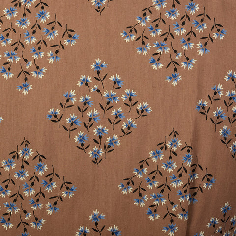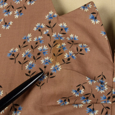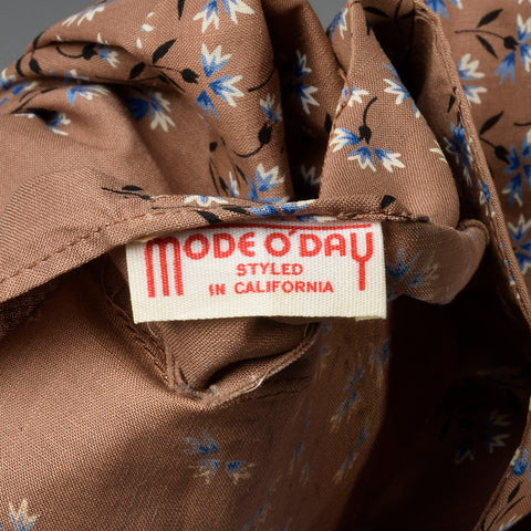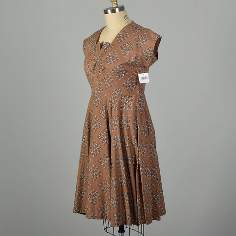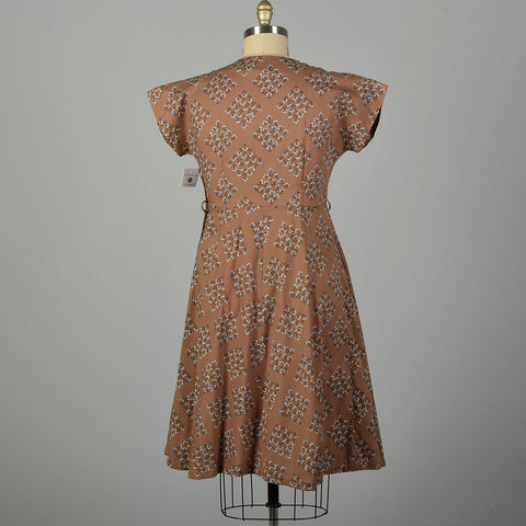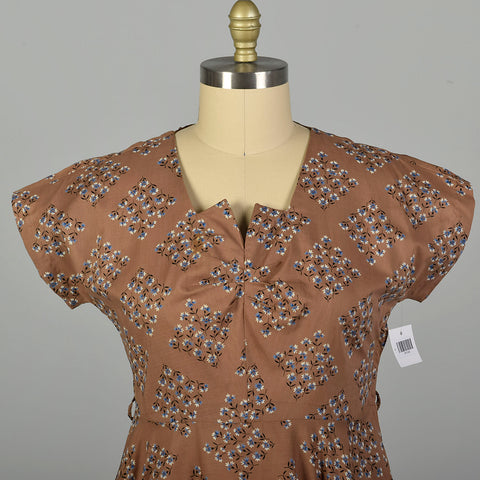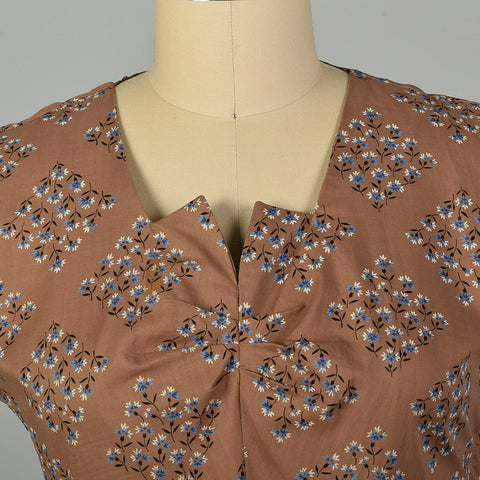 XL 1950s Brown Cotton Day Dress Blue Floral Print Short Sleeves