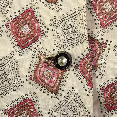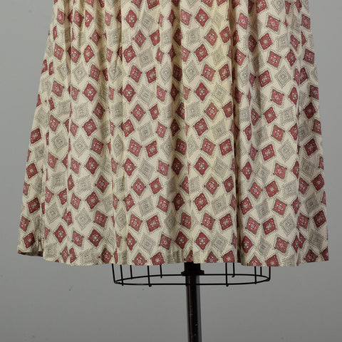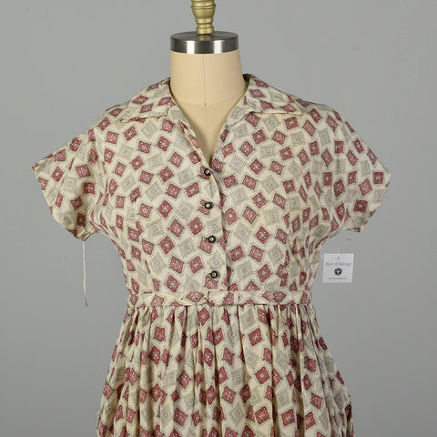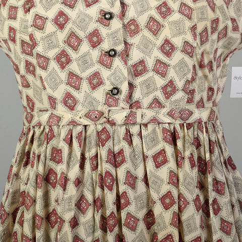 This is a lightweight, cotton day dress with a red diamond print, featuring short sleeves, a fold over collar, and a belted waist. The bodice has f...