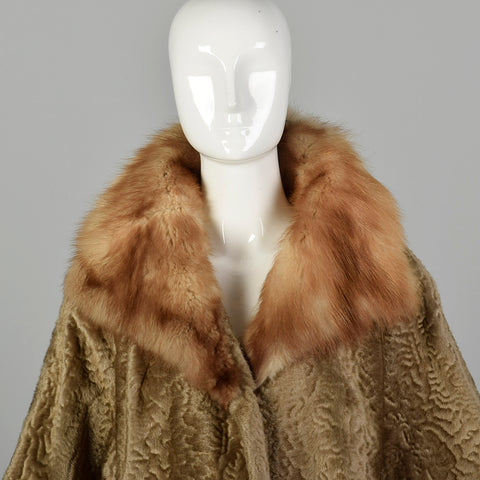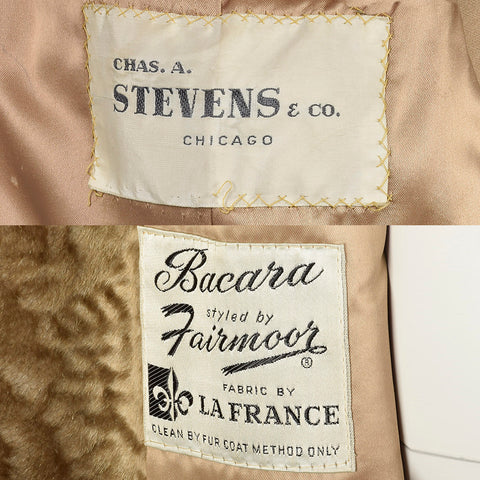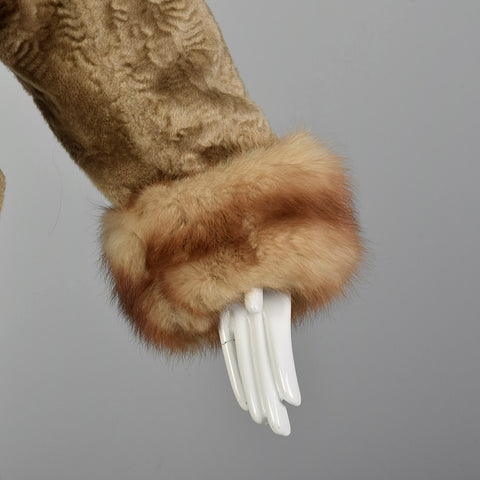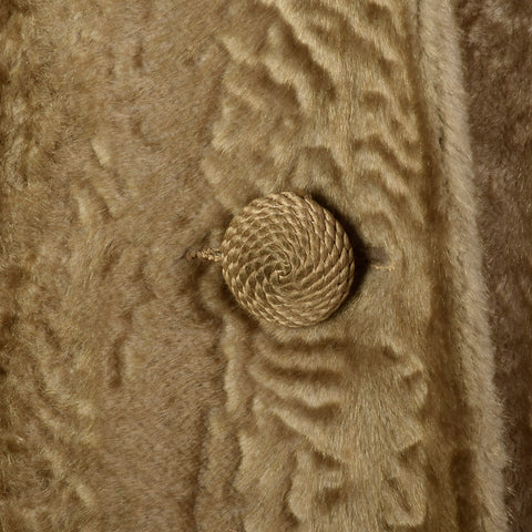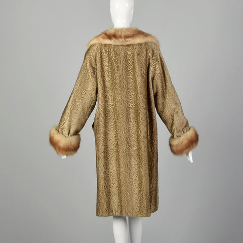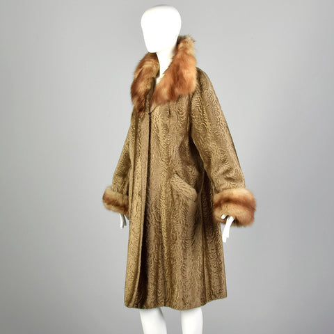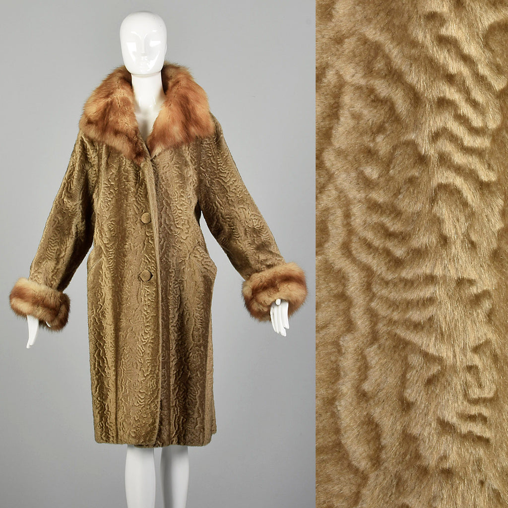This listing is for one coat. The textile is unmarked. Golden tan faux fur coat with real fur collar and cuffs. The faux fur has a textured design....