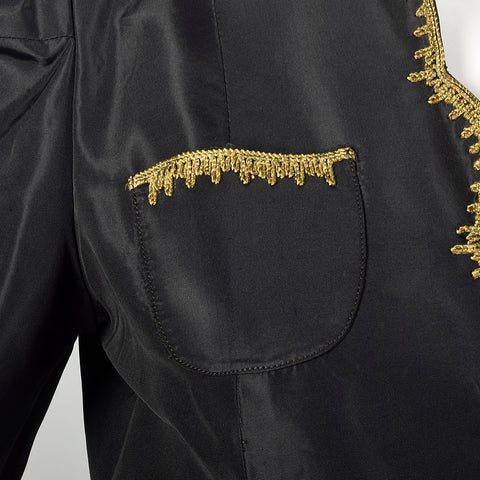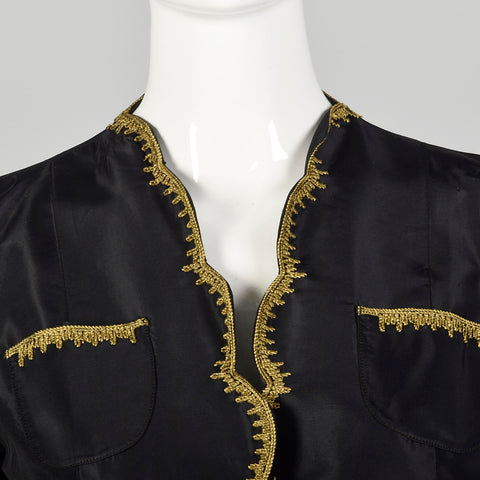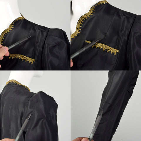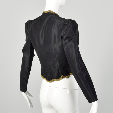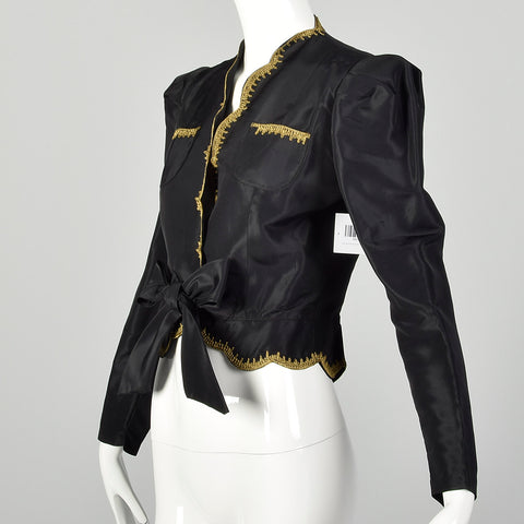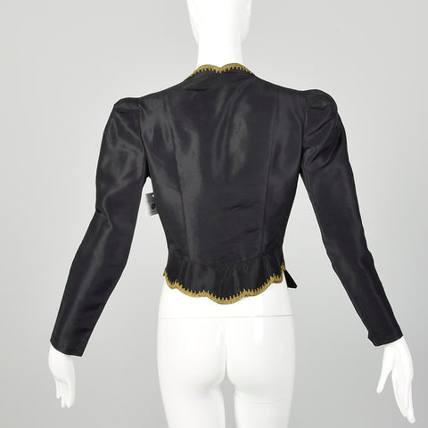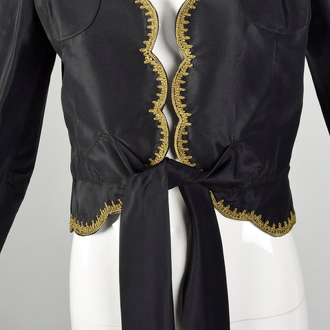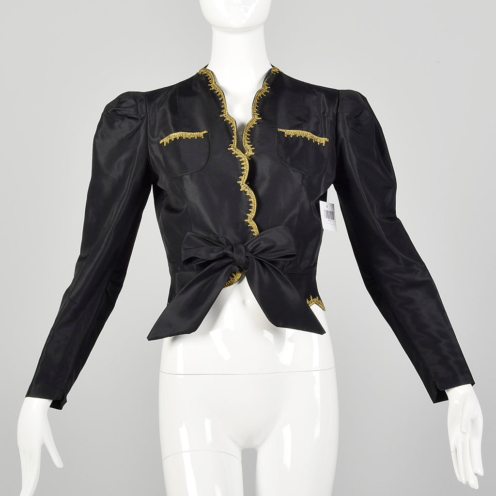 XS 1940s Jacket Black Taffeta Tie Waist Scallop Edge Gold Trim Embroidery Evening Jacket