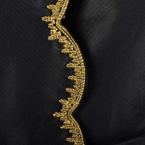 Gorgeous black taffeta jacket. Scalloped edge and peplum. Embroidered gold trim on the collar, front, hem, and of the breast pockets. To jacket clo...