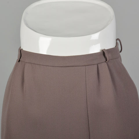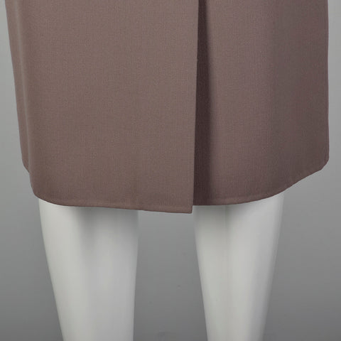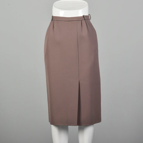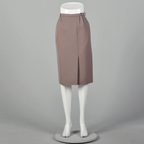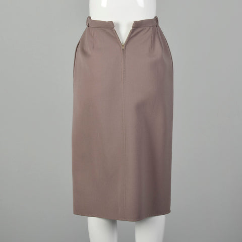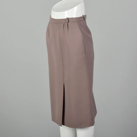 This listing is for one skirt. The textile is unmarked wool. Classic style taupe pencil skirt. Unique asymmetrical slit in the front. Has two hidde...