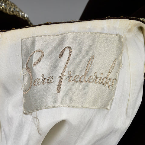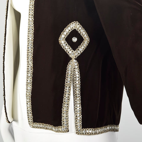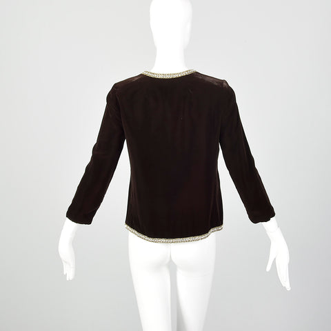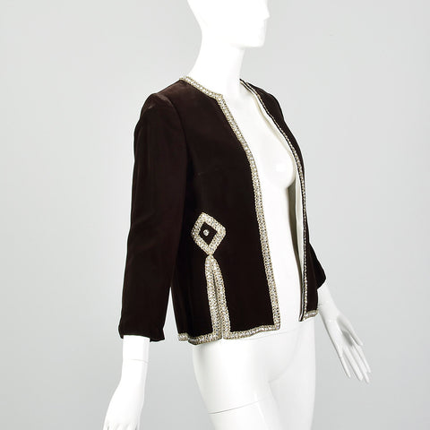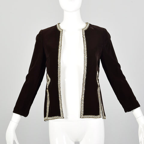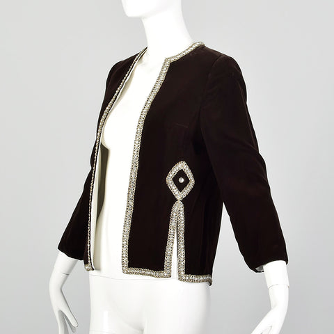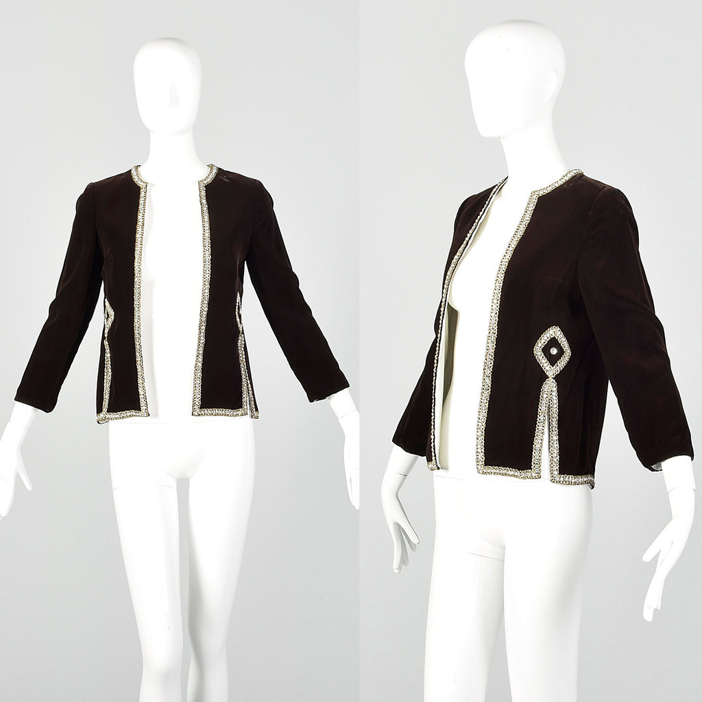 This listing is for one jacket. The textile is unmarked. Rich brown, lush brown velvet. Rhinestone and metallic trim. Over the side slit are two di...