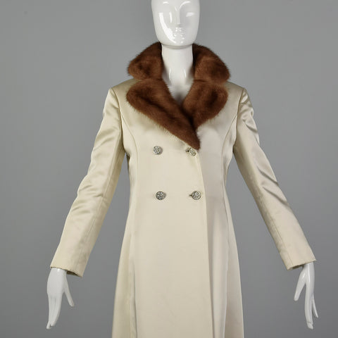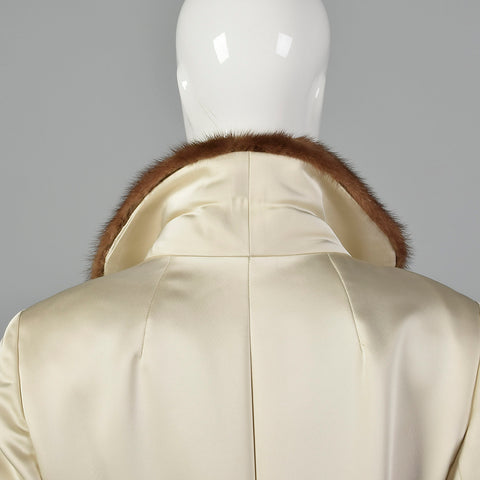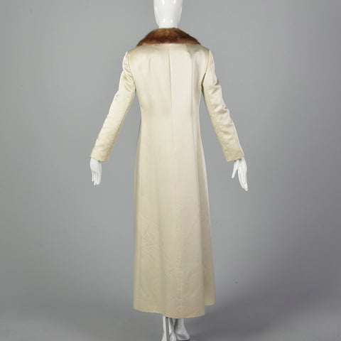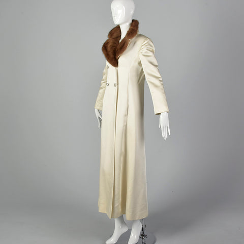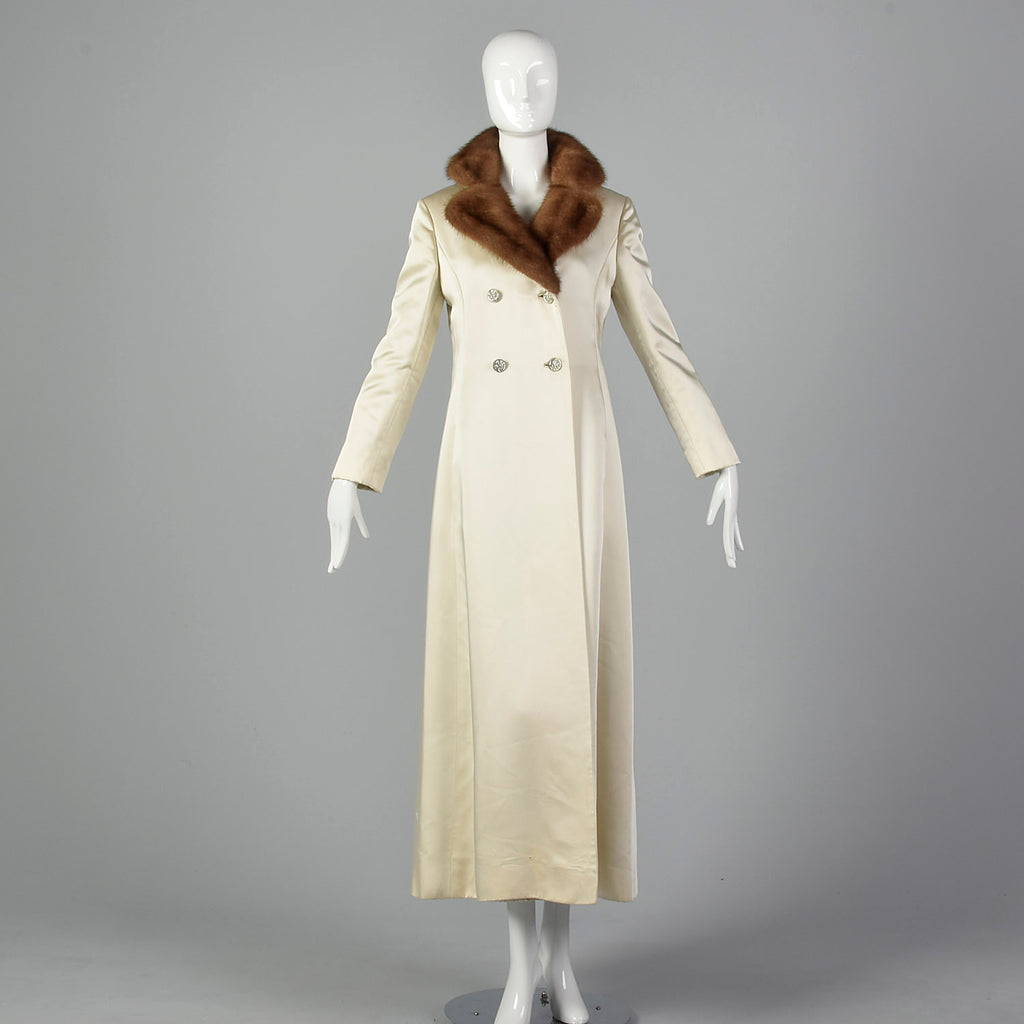 This listing is for one coat. The textile is unmarked, but feels like satin. Fabulous cream, opera coat with a mink fur collar. Long length, with a...