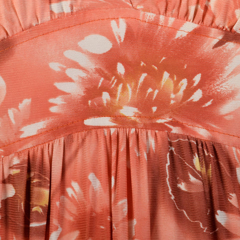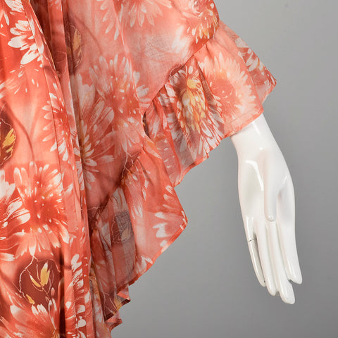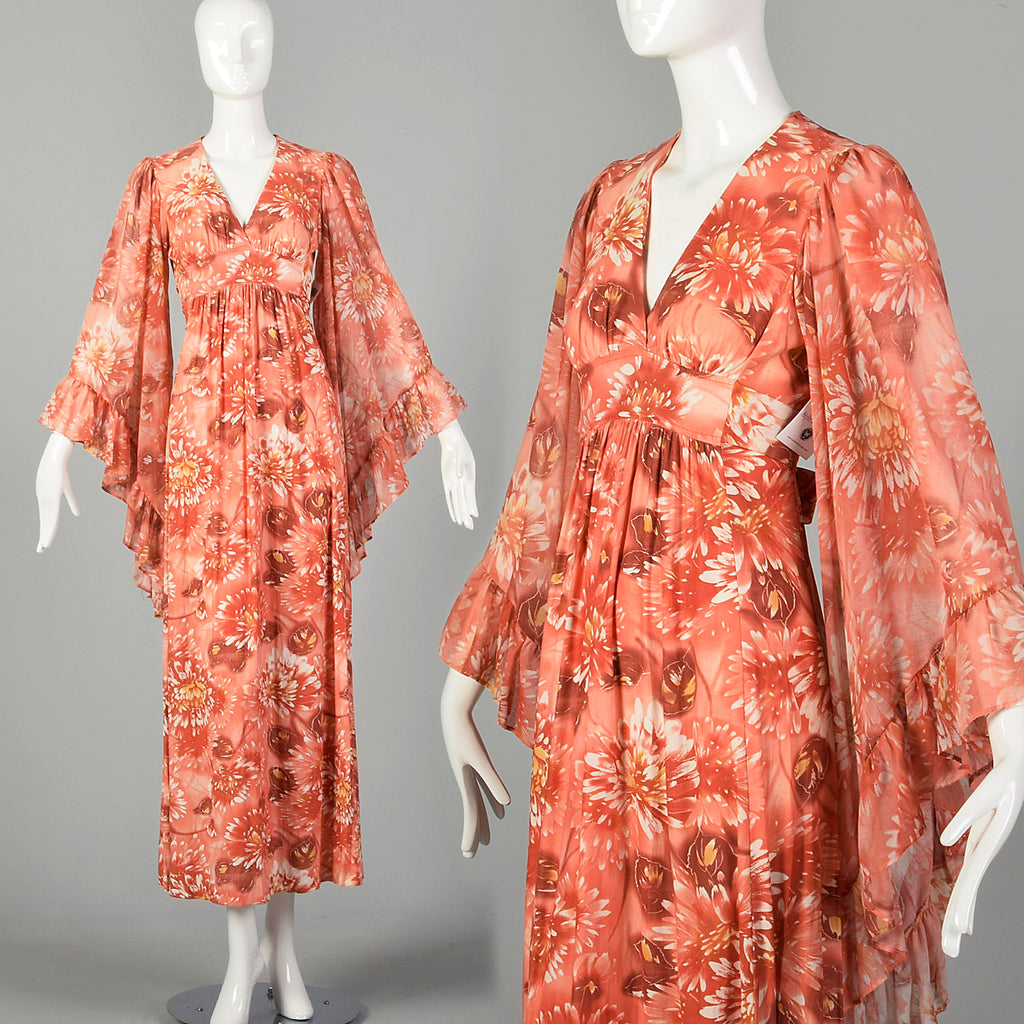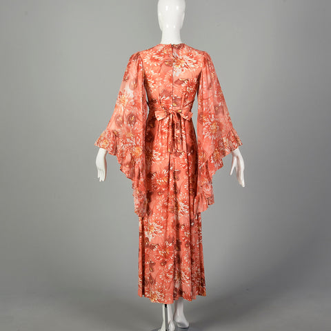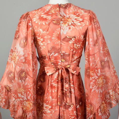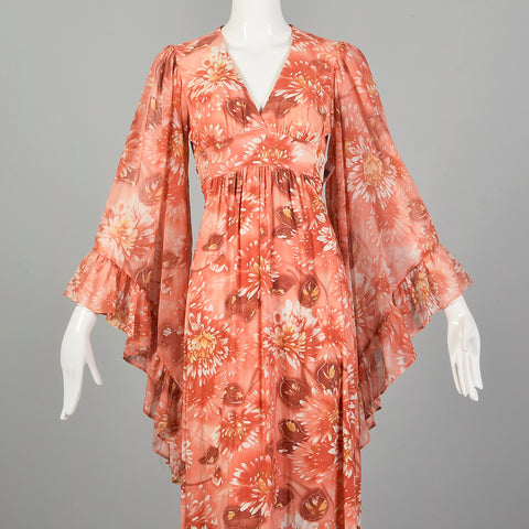 XS 1970s Pink Boho Maxi Dress Hippie Floral Print Bell Sleeves with Tieback Waist
