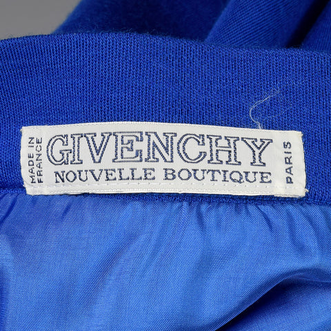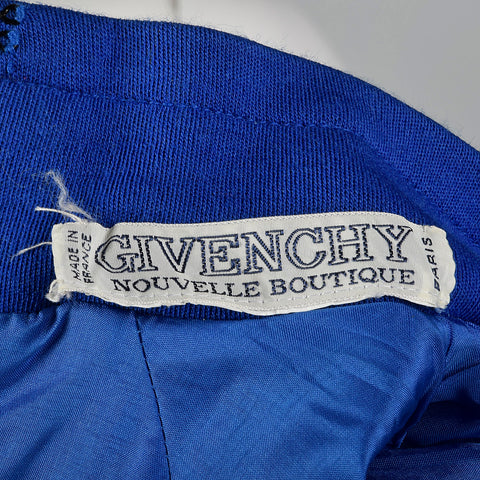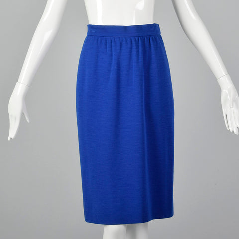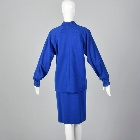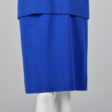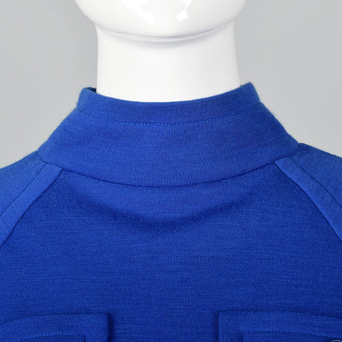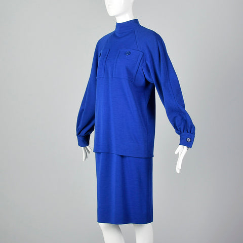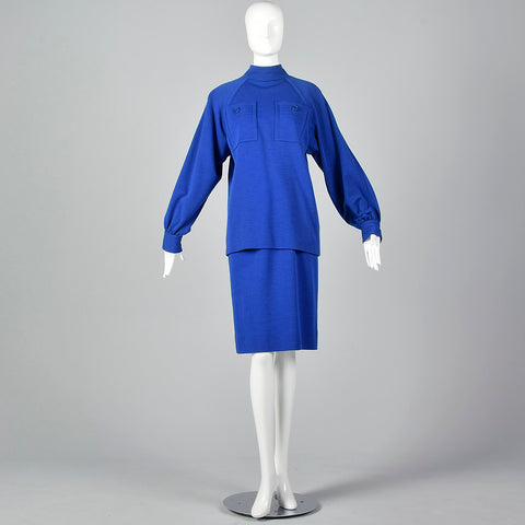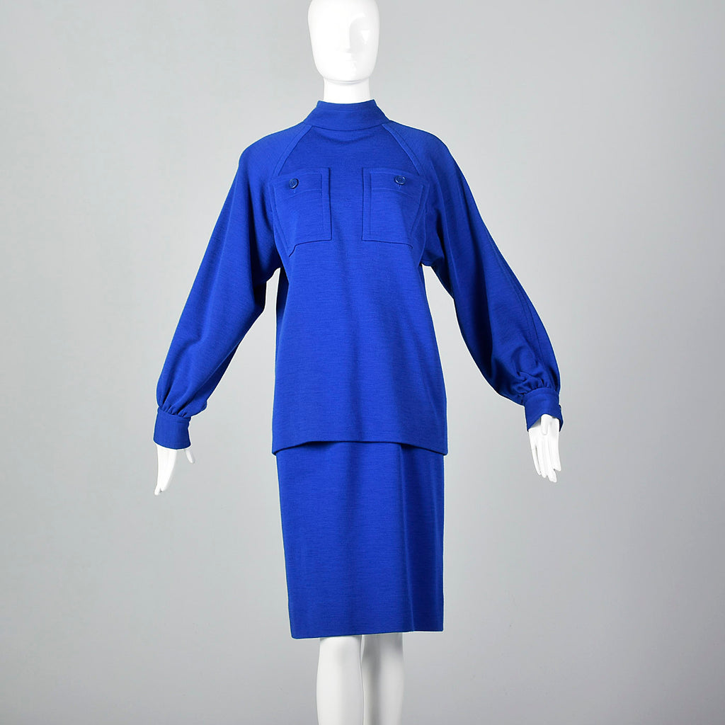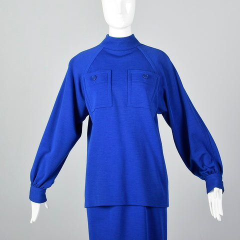 This listing is for one skirt set consisting of one skirt and one top. Textile is unmarked. Blue knit set. Long sleeve, high neck top with two fron...