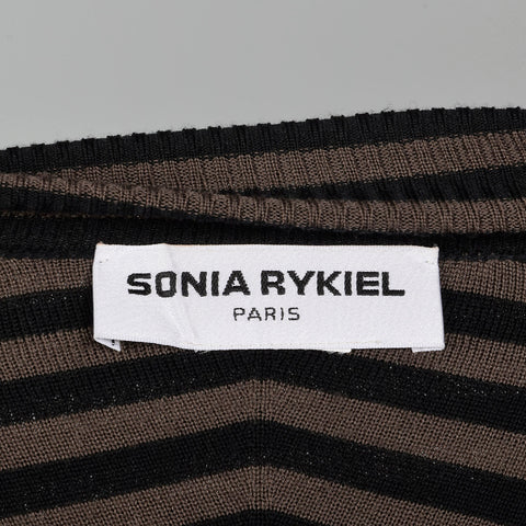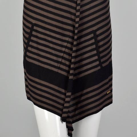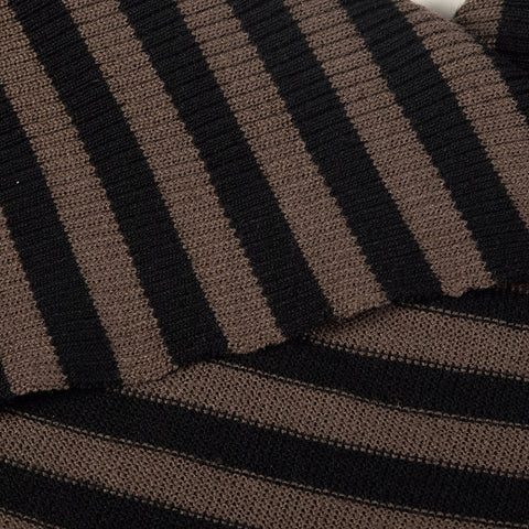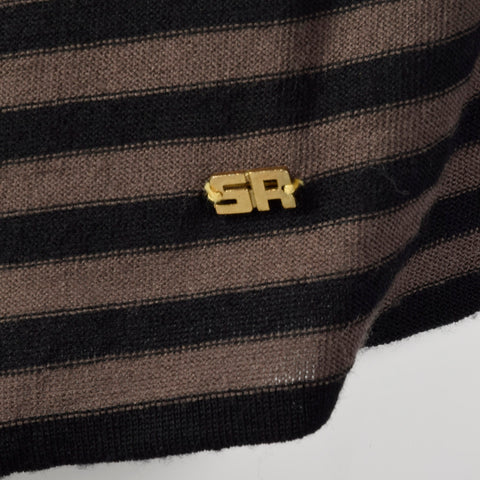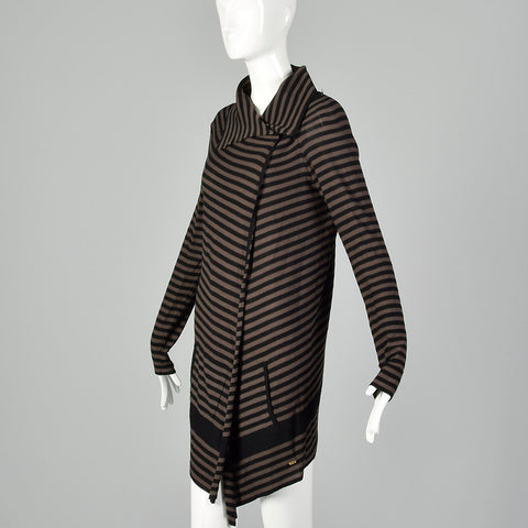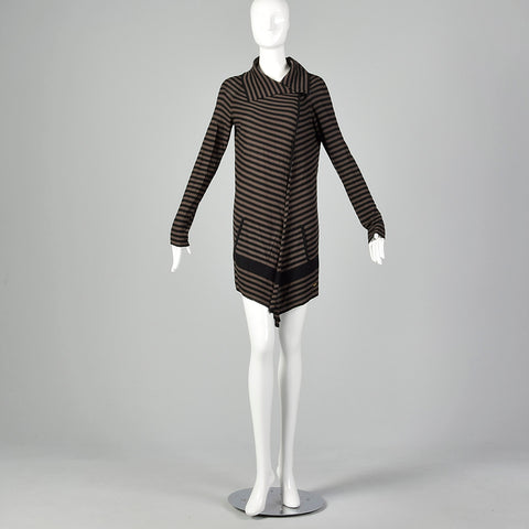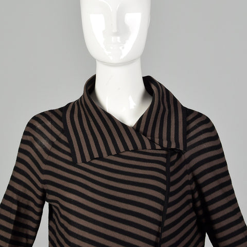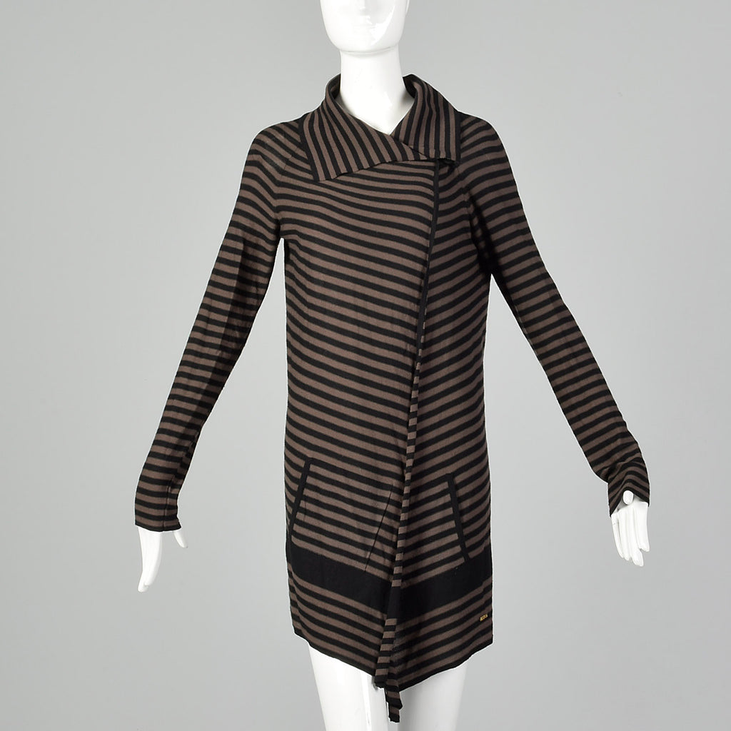 This listing is for one sweater. The textile is unmarked. Lightweight brown and black sweater. Asymmetrical collar and front hem. Wrap top closure....
