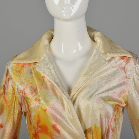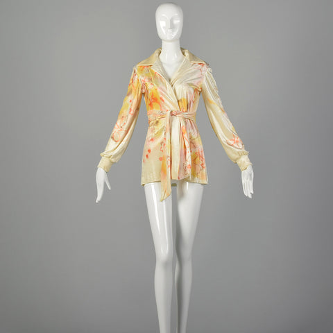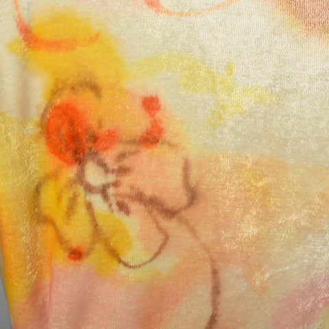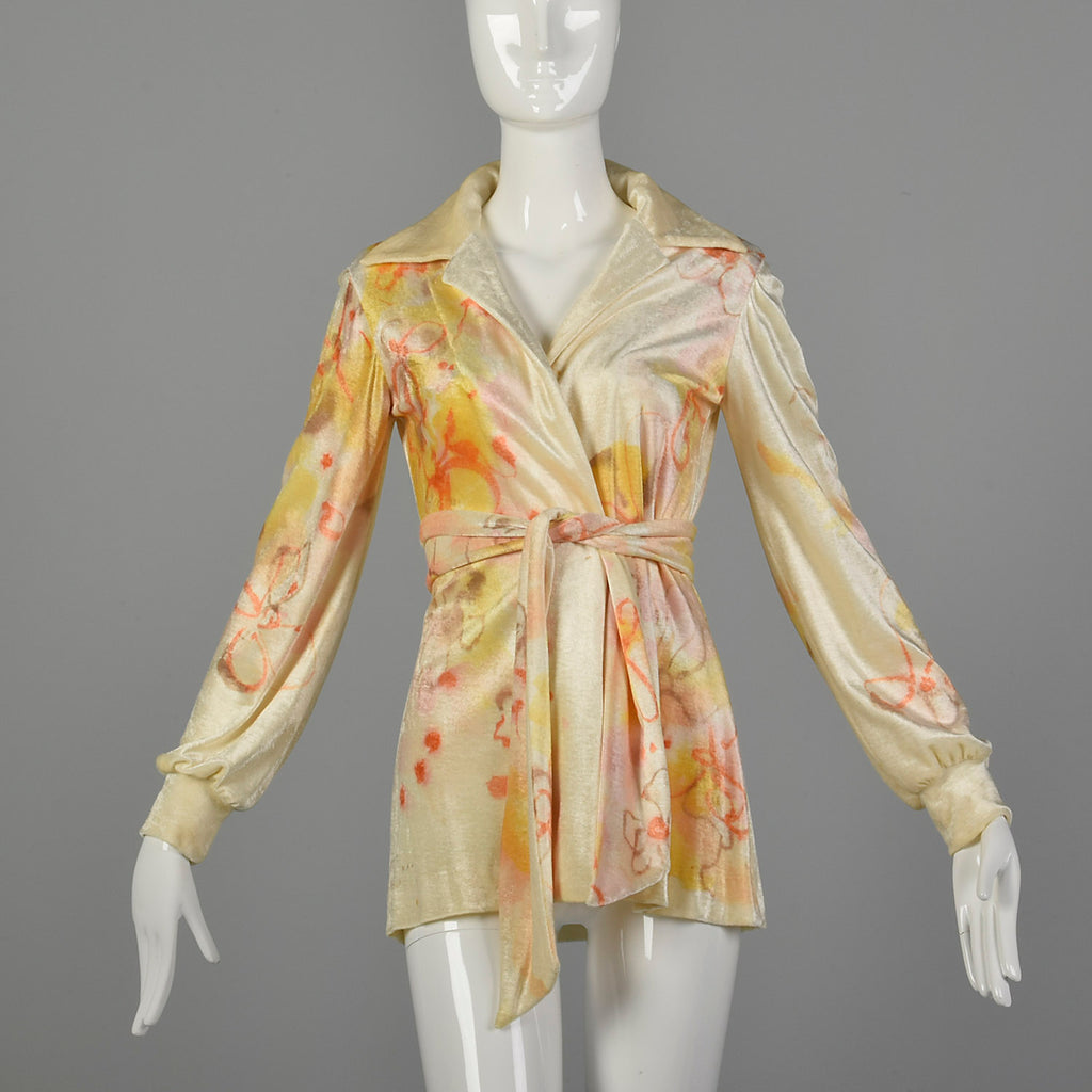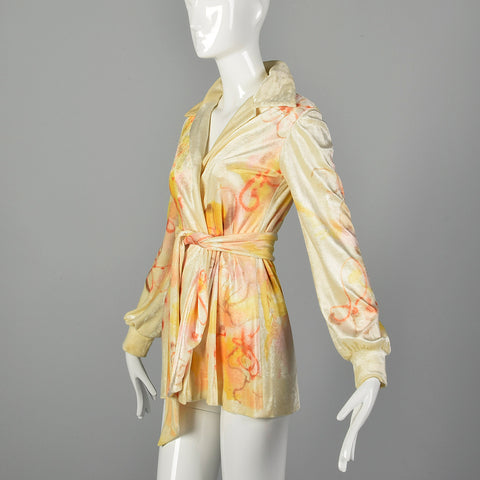 This listing is for one top. Textile is unmarked. Groovy ivory wrap top. Blouse is made from very soft velour. Orange, red, and pink floral pattern...