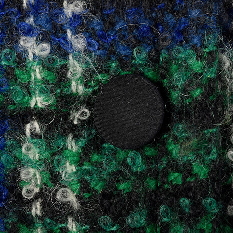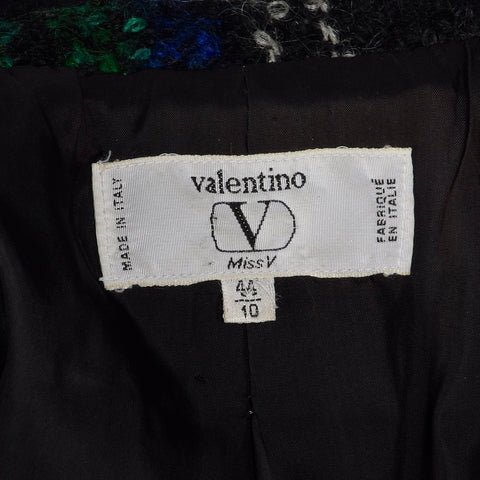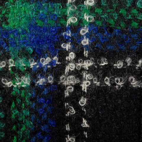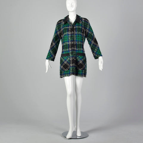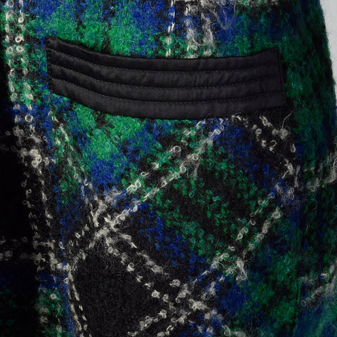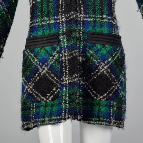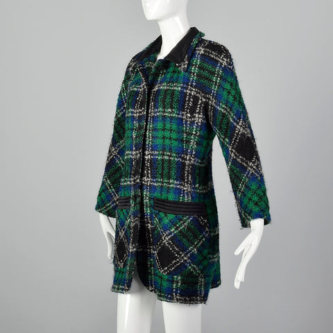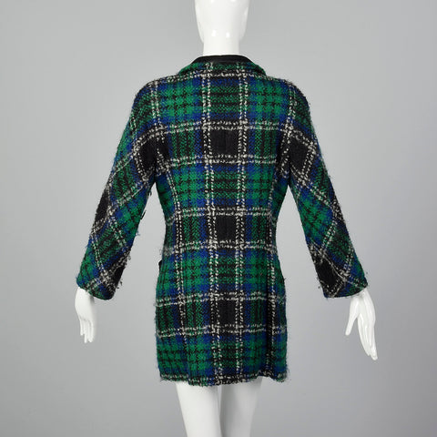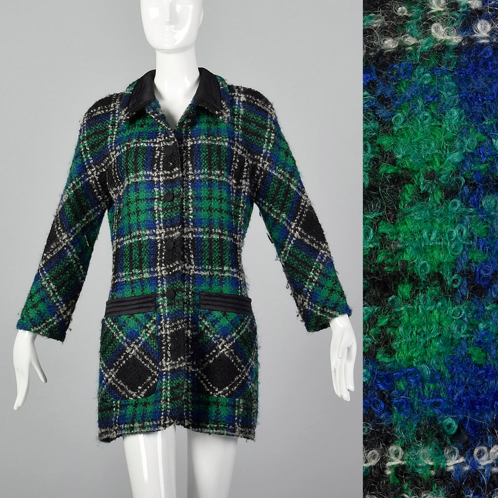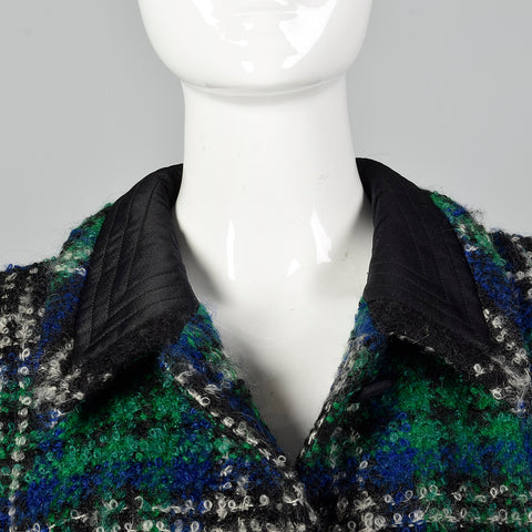 This listing is for one coat. The textile is a wool/mohair blend. Excellent fuzzy boucle knit plaid jacket in deep blue, green, white and black. Th...