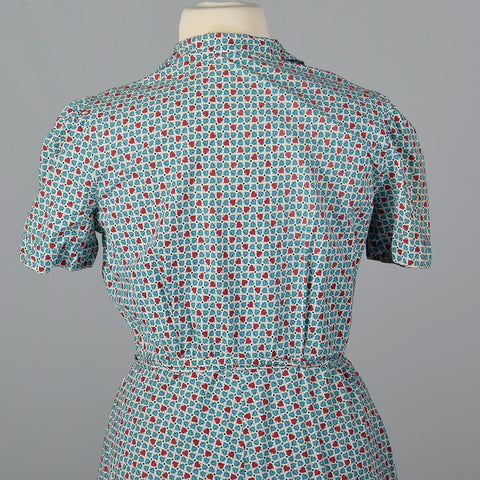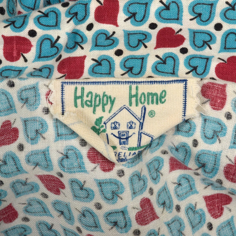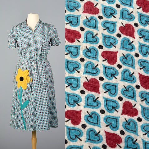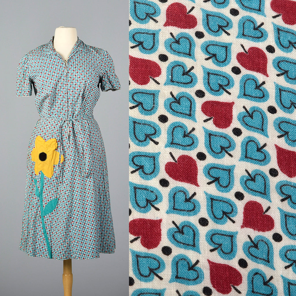 This listing is for one dress. Textile is an unmarked lightweight cotton. Dress features adorable heart / leaf / spade print in blue and red with s...