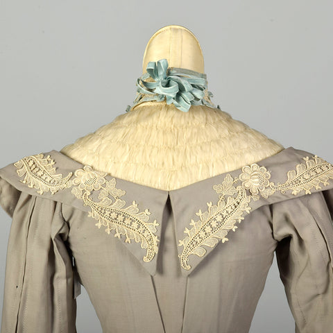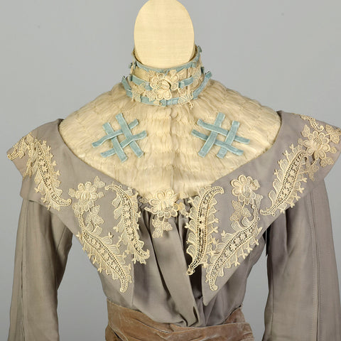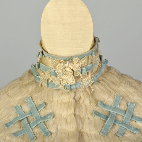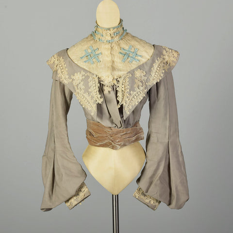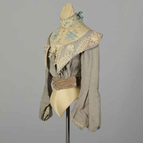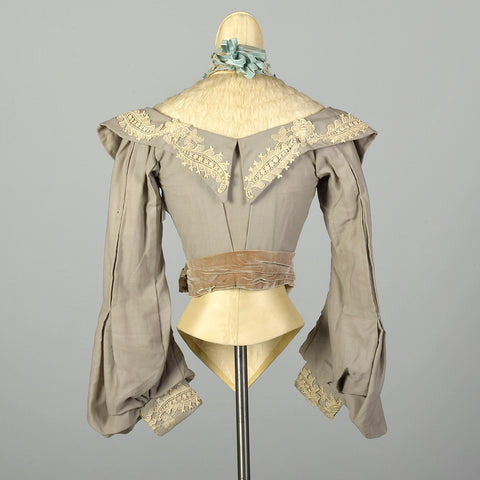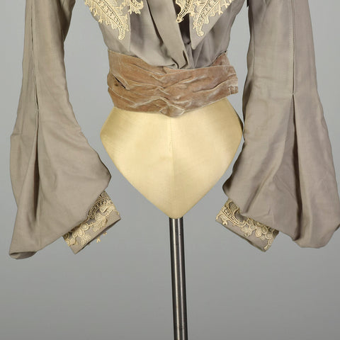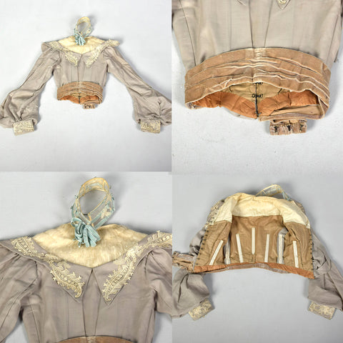 This listing is for one bodice. Textile is an unmarked mid weight wool challis with silk and velvet. Antique bodice features fabulous high still co...