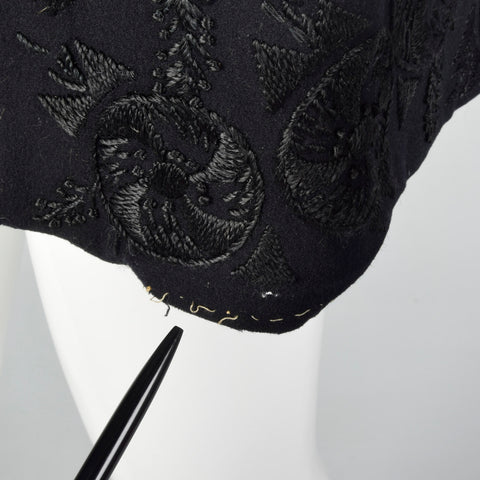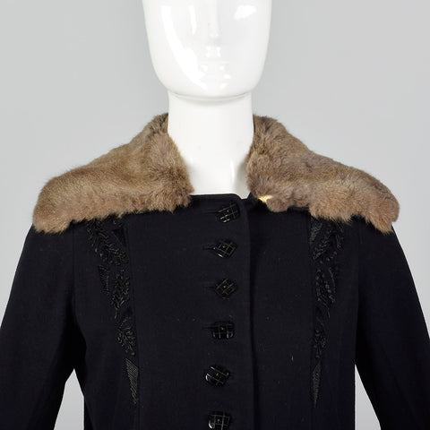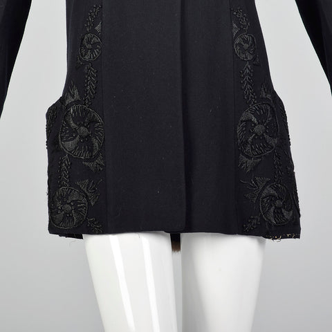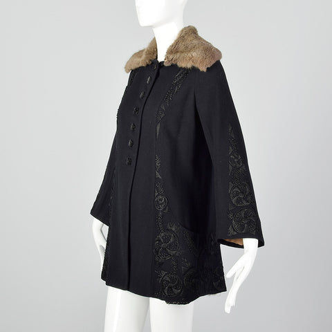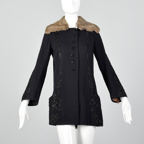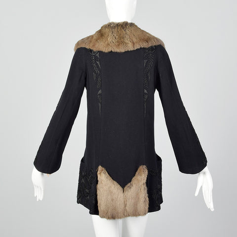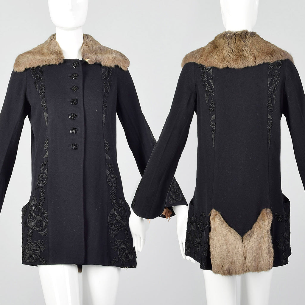 XXS 1920s Embroidered Wool Jacket with Rabbit Fur